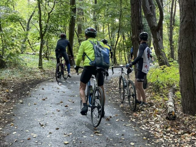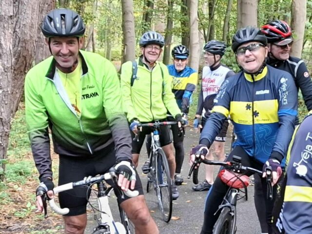 Na de koffiebreak duiken we de duinen in en rijden via Ter Heijde richting Hoek van Holland. Daar lopen we even vast, maar Leo — al een tijdje op kop — loodst ons naar het Hoekse Bosje. Wat een ontdekking! Prachtige oude bomen, een historisch stukje natuur waar de meesten van ons nog nooit geweest zijn.