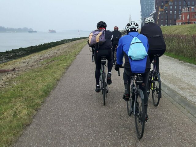 Met z’n vijven — Gerrit vdH, Frank B, Ron vdH, Leo S en ik zelf — gingen we op pad. Via Vlaardingen Oost, de Vulcaanweg en de Deltawég reden we langs Het Scheur richting Maassluis. Plotseling sloeg Leo rechtsaf en nam het klimmetje van het Engelandvaardersviaduct. Ik wist niet eens dat het zo heette, maar volgens Leo moest ik dat onthouden. Je bent nooit te oud om wat te leren, toch?