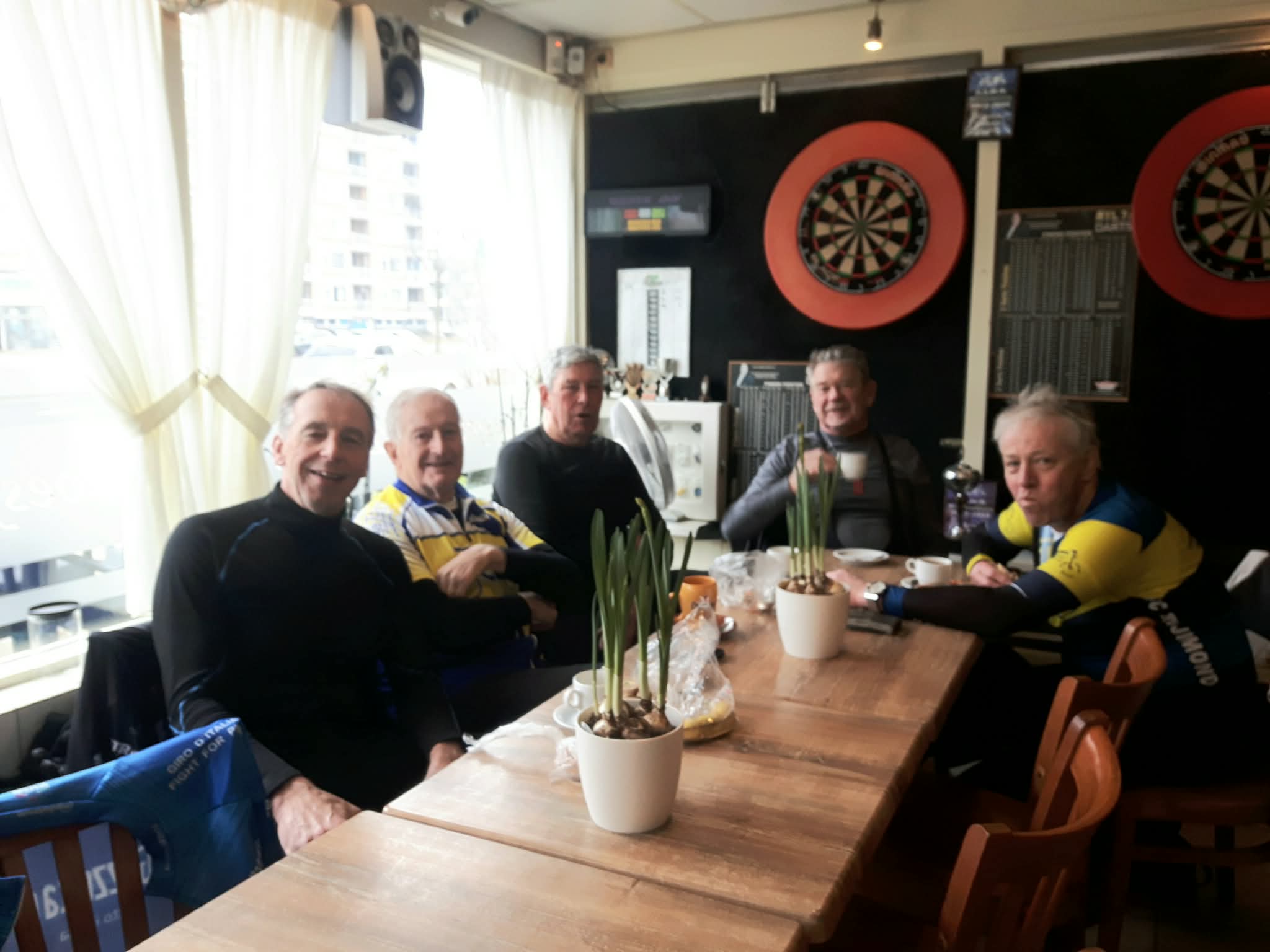 Daarna ging het kriskras door het Westland: Honselersdijk, Poeldijk, zigzaggend naar Madestein, Ockenburgh en Loosduinen. Tijd voor de koffiebreak bij “Loesje”, waar het zoals altijd behaaglijk warm en gezellig was. De koffie en chocolademelk smaakten uitstekend — precies wat we nodig hadden na die snijdende oostenwind.