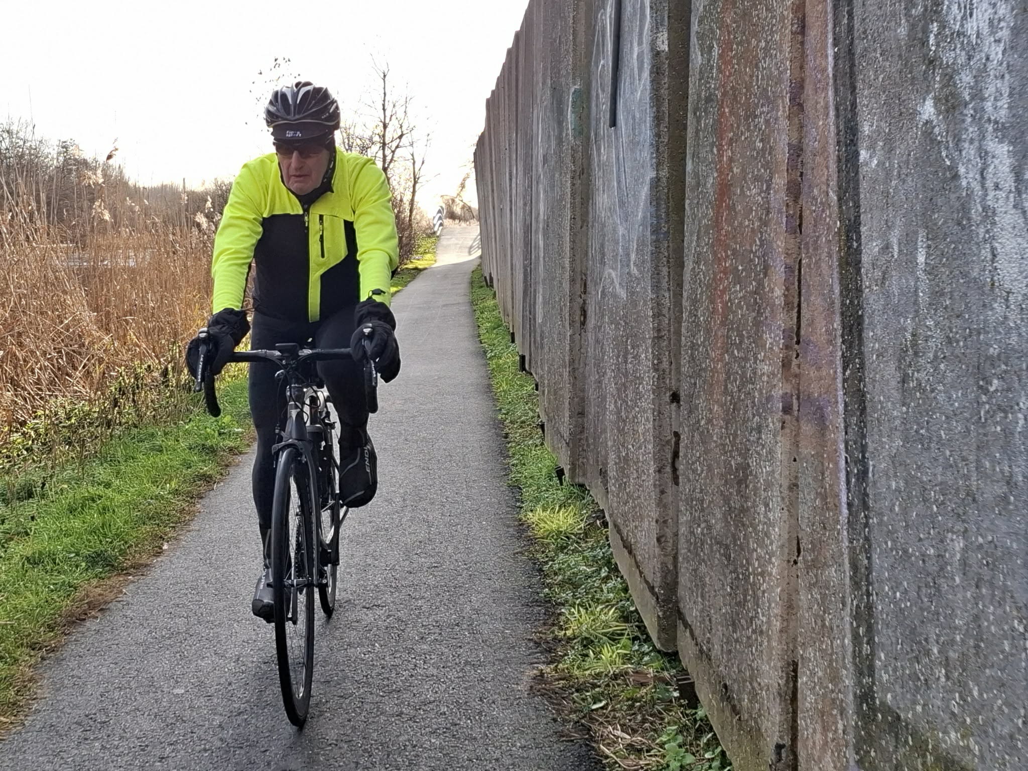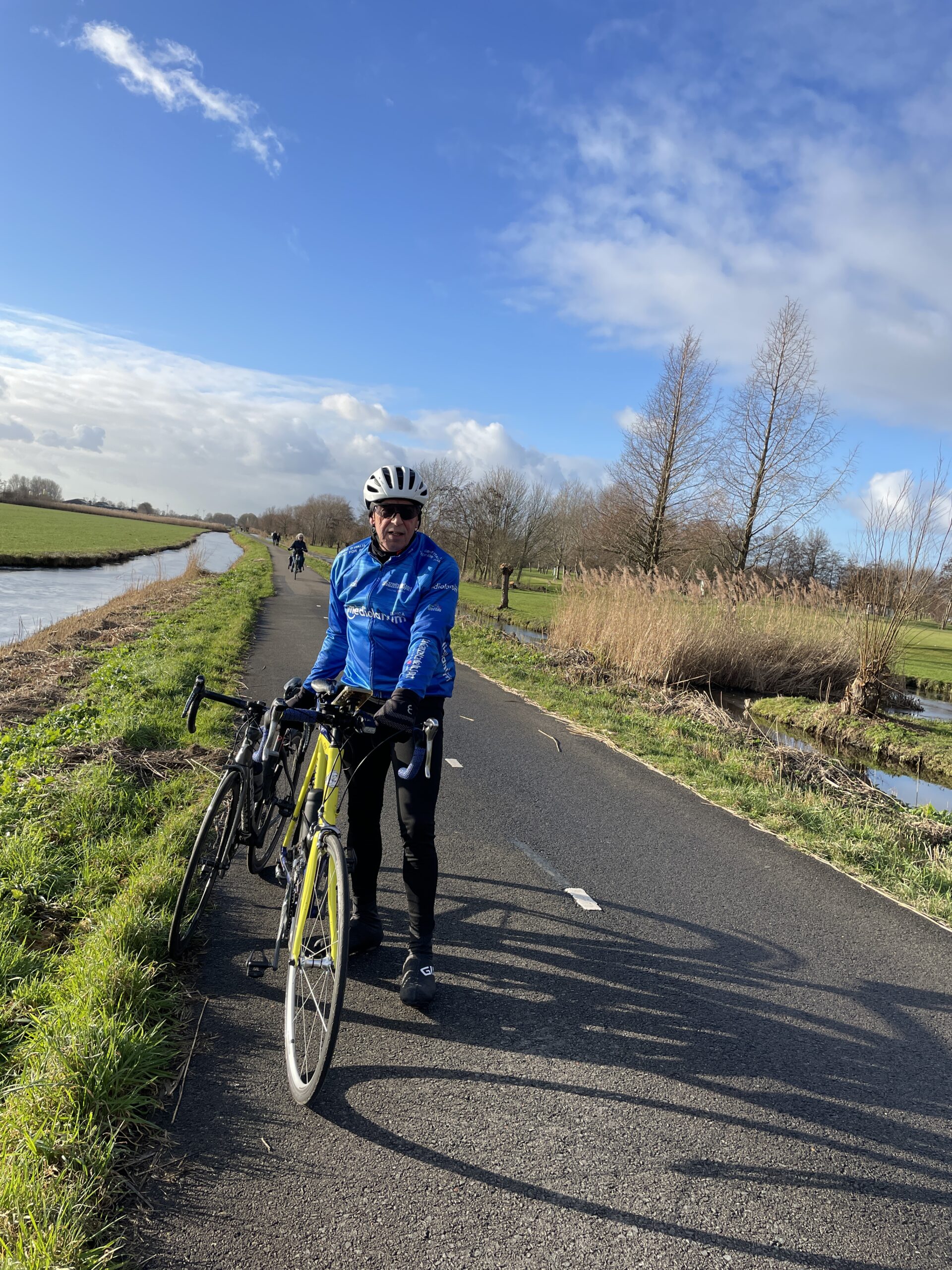 Hij neemt meteen de leiding en we rijden in een rustig tempo. Het kan hier en daar nog glad zijn; sloten en vaarten liggen nog dichtgevroren. We zigzaggen richting Schipluiden en Den Hoorn. In de verte zien we drie man van de TCR rijden — later blijken het Gerrit, Marcel en Ton te zijn — maar ze verdwijnen al snel uit beeld.