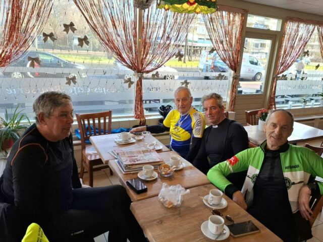 Wij volgen ons eigen tempo richting Wateringen en via Ockenburg naar Kijkduin voor een bakkie bij Loesje. Waar anders? Gerrit, Marcel en Ton zitten al aan de koffie en wij schuiven gezellig aan.