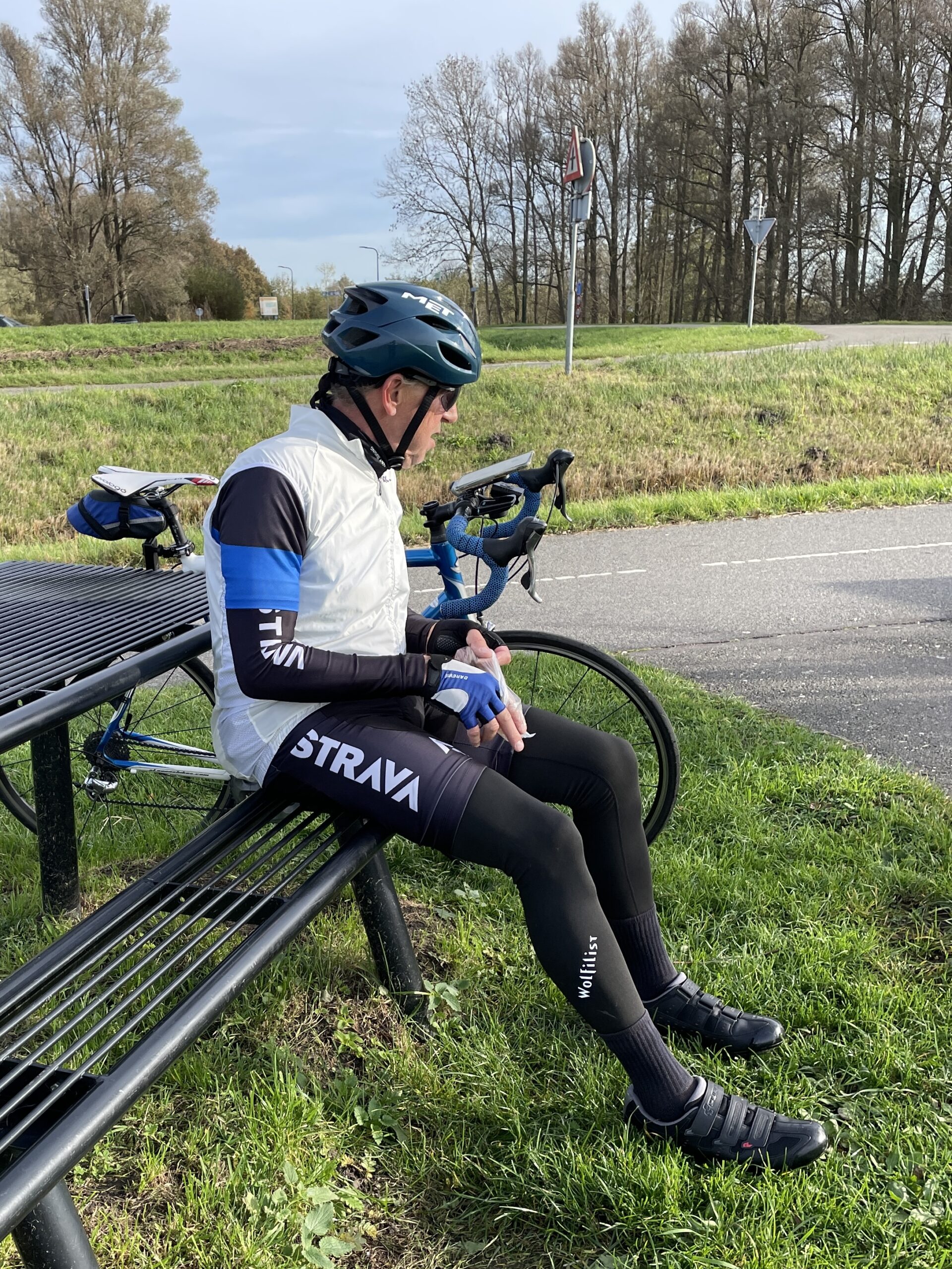 De sfeer zat er meteen goed in. Ik belandde spontaan op kop en besloot dat plekje niet meer af te staan — het voelde als mijn vertrouwde rondje. We trapten stevig door via de Kandelaar, Delfgauw en Nootdorp, richting het Leidschendammerhout. Bij de Vogelplas was het tijd voor een koekiestop: even bijtanken en genieten van het uitzicht.