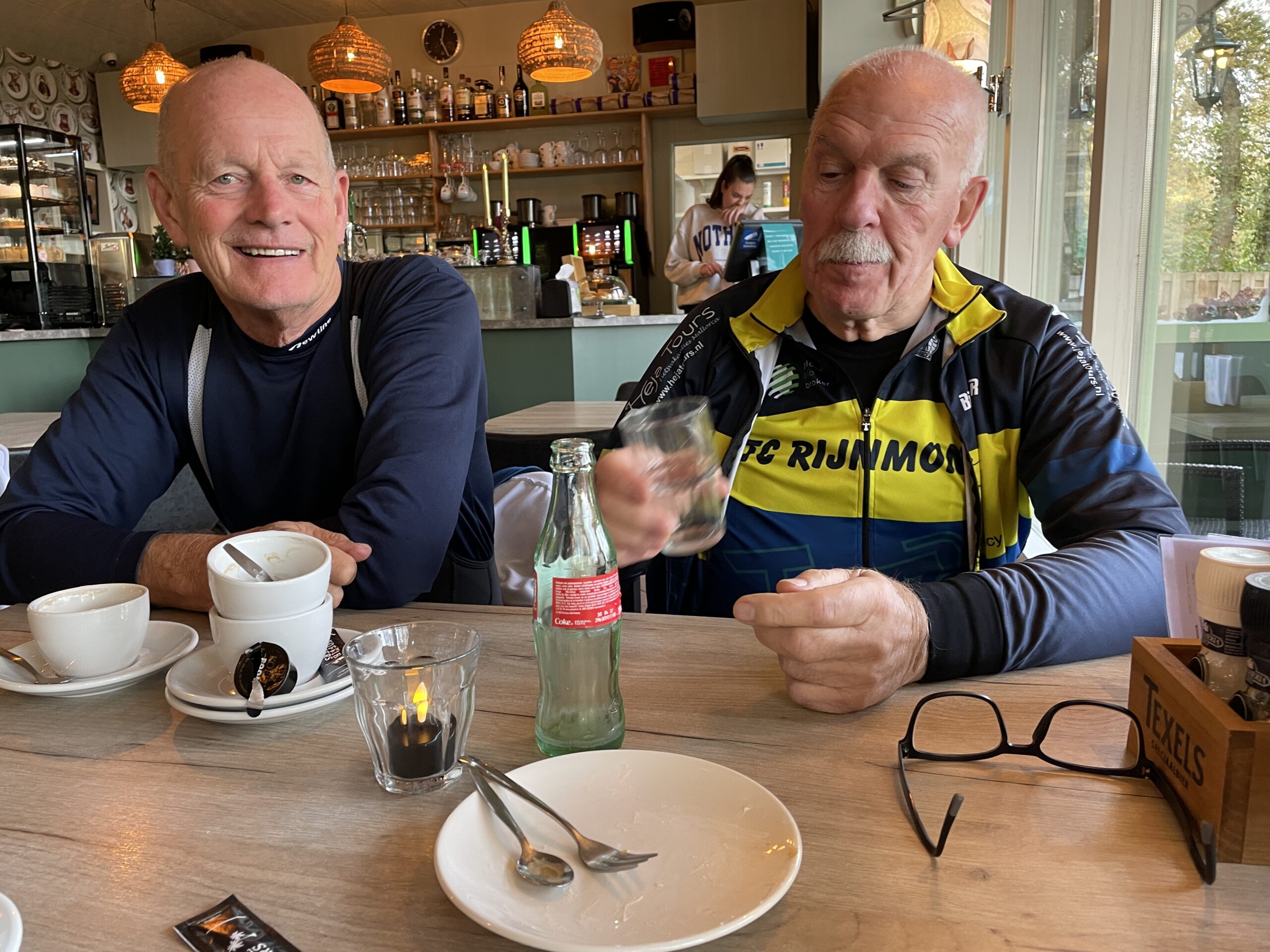 Daarna rolden we door Voorschoten en langs het Valkenburgse Meer, waar het pad nog steeds afgesloten was. Zigzaggend vonden we onze weg naar Wassenaar, voor een welverdiend bakkie bij De Klip. Wat een verrassing: het café was helemaal opgeknapt en wordt nu gerund door een paar hartelijke dames. De sfeer was warm, de koffie sterk, en de gesprekken nog sterker.