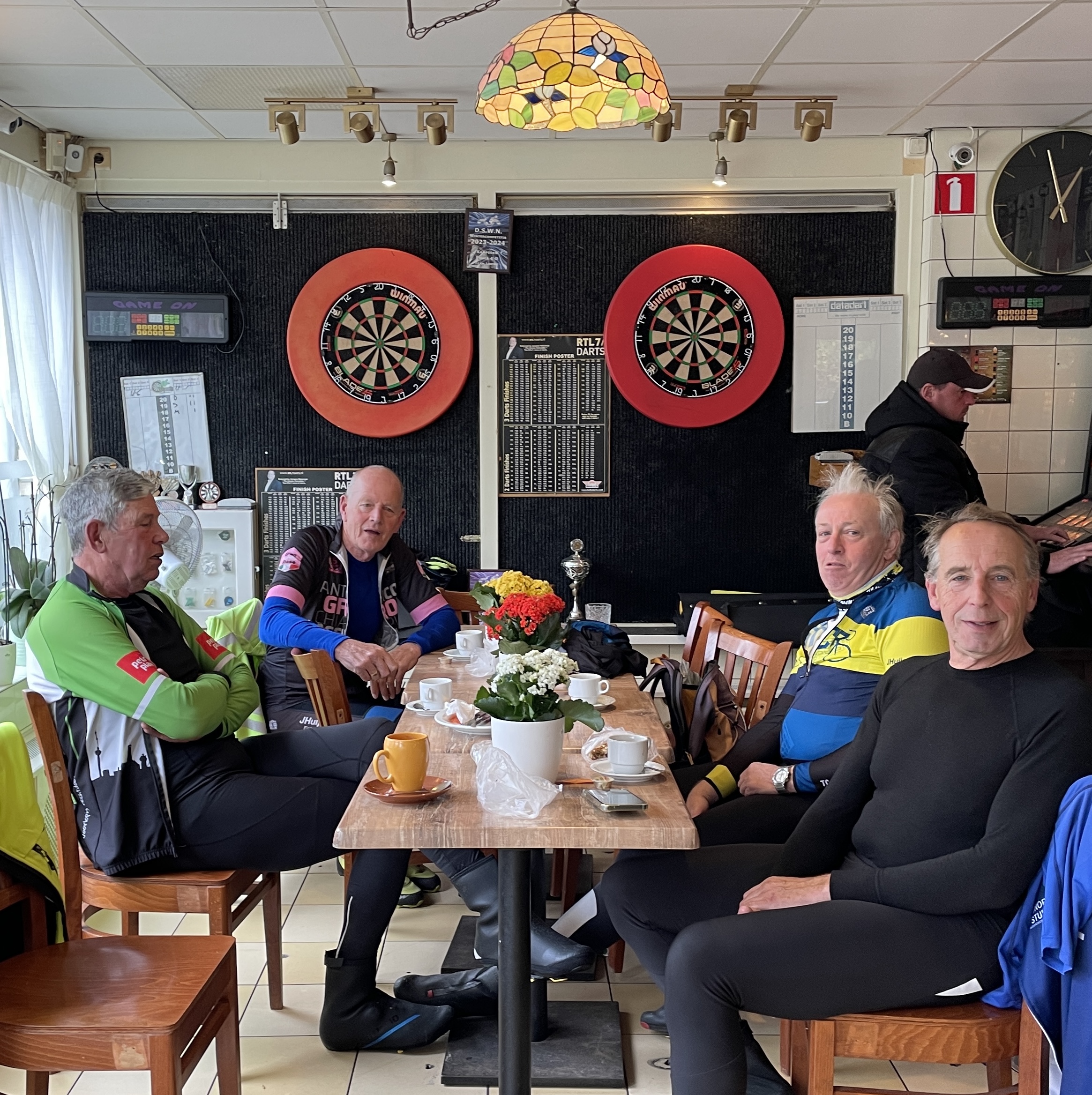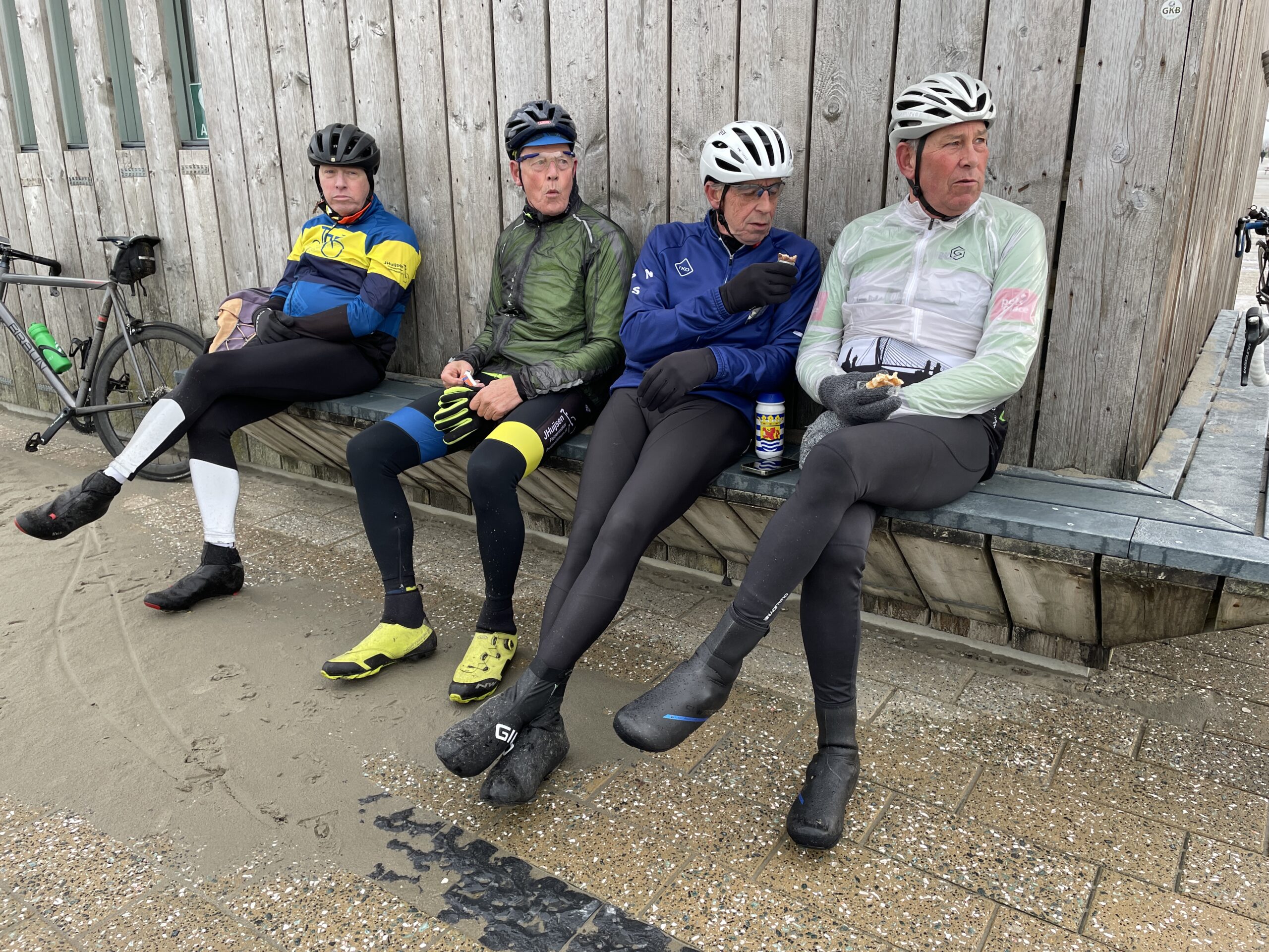 Bij Hermes zaten FranB en EdS al ongeduldig te wachten. Even later kwamen ook GerritvdH en LeoS precies op tijd aan. Gerrit had nieuwe schoenen en moest zijn schoenplaatjes nog even afstellen. Leo werd tot kopman gebombardeerd en nam meteen ook de rol van rijdend fotograaf op zich.