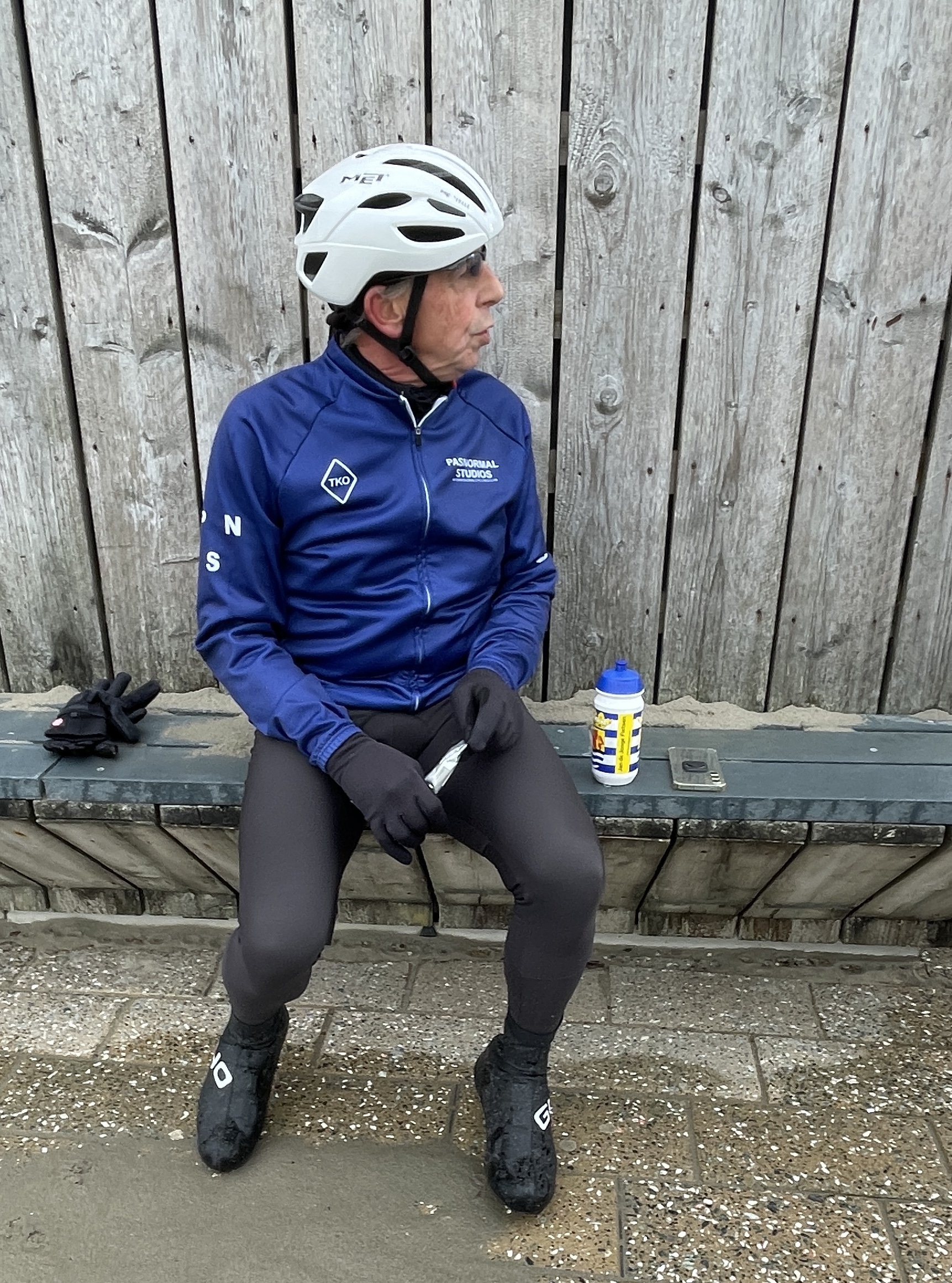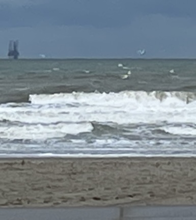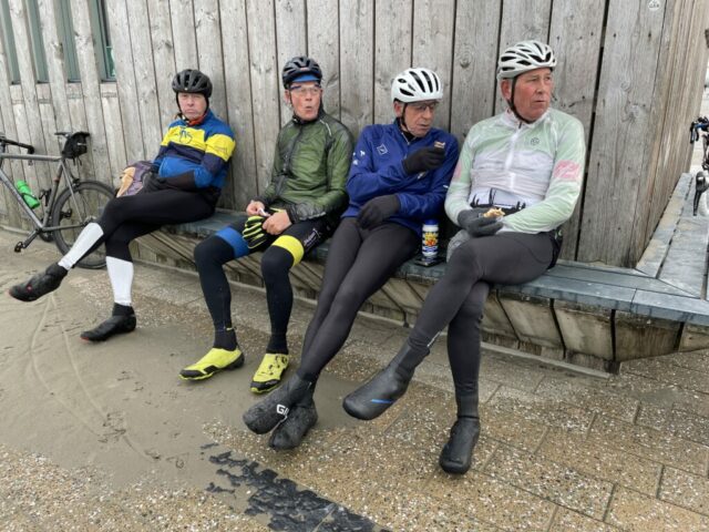 Leo, onze fotograaf, reed opnieuw op kop, dit keer met een flinke tegenwind. Een klein buitje zorgde ervoor dat sommigen hun regenjasje aantrokken, maar boven Hoek van Holland brak de zon door. Traditioneel hielden we daar een koekiestop om de woelige baren te bewonderen: indrukwekkende golven sloegen stuk, een prachtig gezicht.