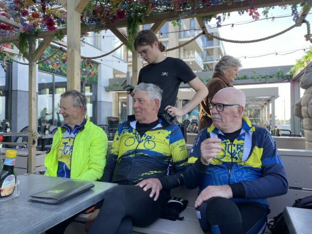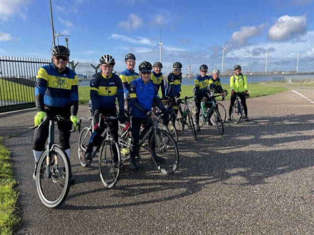 Gerrit neemt de kop en leidt ons in een gemoedelijk tempo via de buitenkant van Vlaardingen naar Maassluis. Na de Steendijkpolder verrast hij ons met een onverwachte afslag. We zigzaggen door het landschap en komen uiteindelijk vlak voor de imposante Maaslandkering uit. Sommigen pakken het klimmetje mee, en iets verderop hergroeperen we voor een klassiek Kodak-moment.