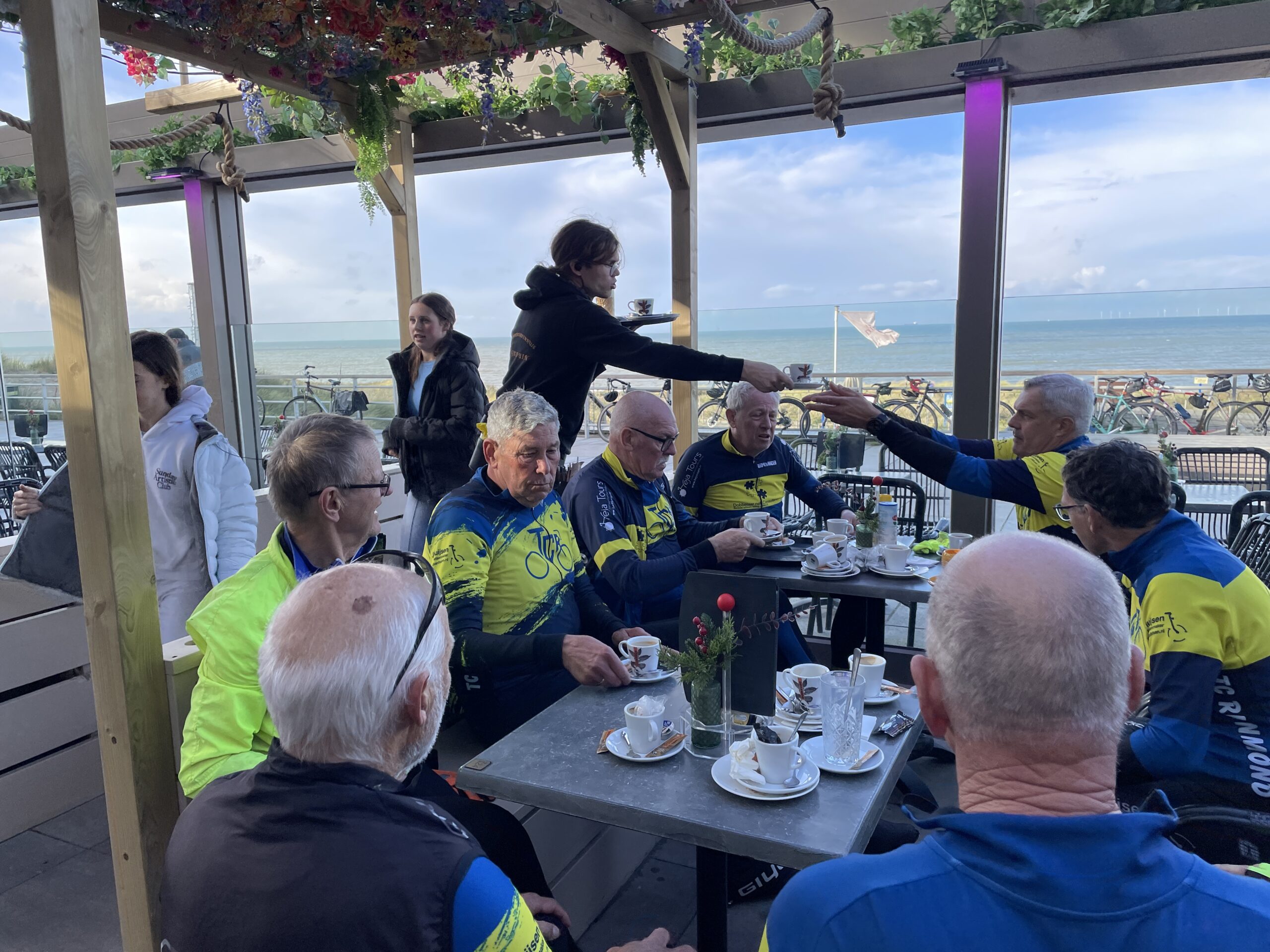 Bestemming bereikt: tijd voor koffie bij “Loesje”. Maar… gesloten! Wat nu? Ik stel voor om uit te wijken naar het Pannenkoeken- en Poffertjesrestaurant op de Boulevard. Uitzicht op de Noordzee, zon op het gezicht, en een menukaart vol lekkers. Appelpunten met slagroom vliegen over de toonbank, flitsers klikken. Zelf houd ik het bescheiden: warme chocolademelk en een decafé. De sfeer is top—veel gelach, veel verhalen.