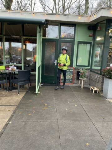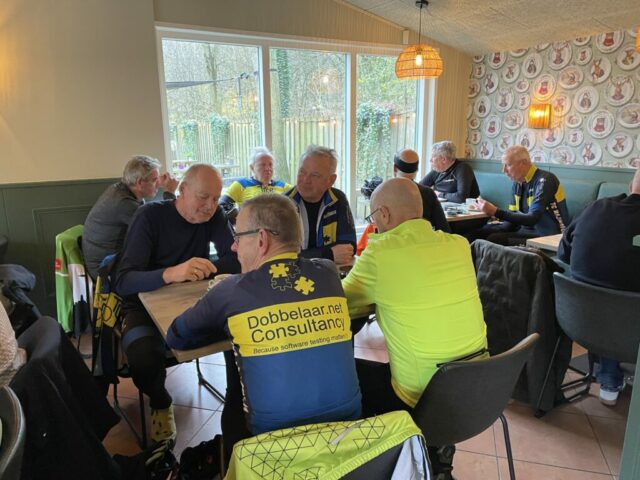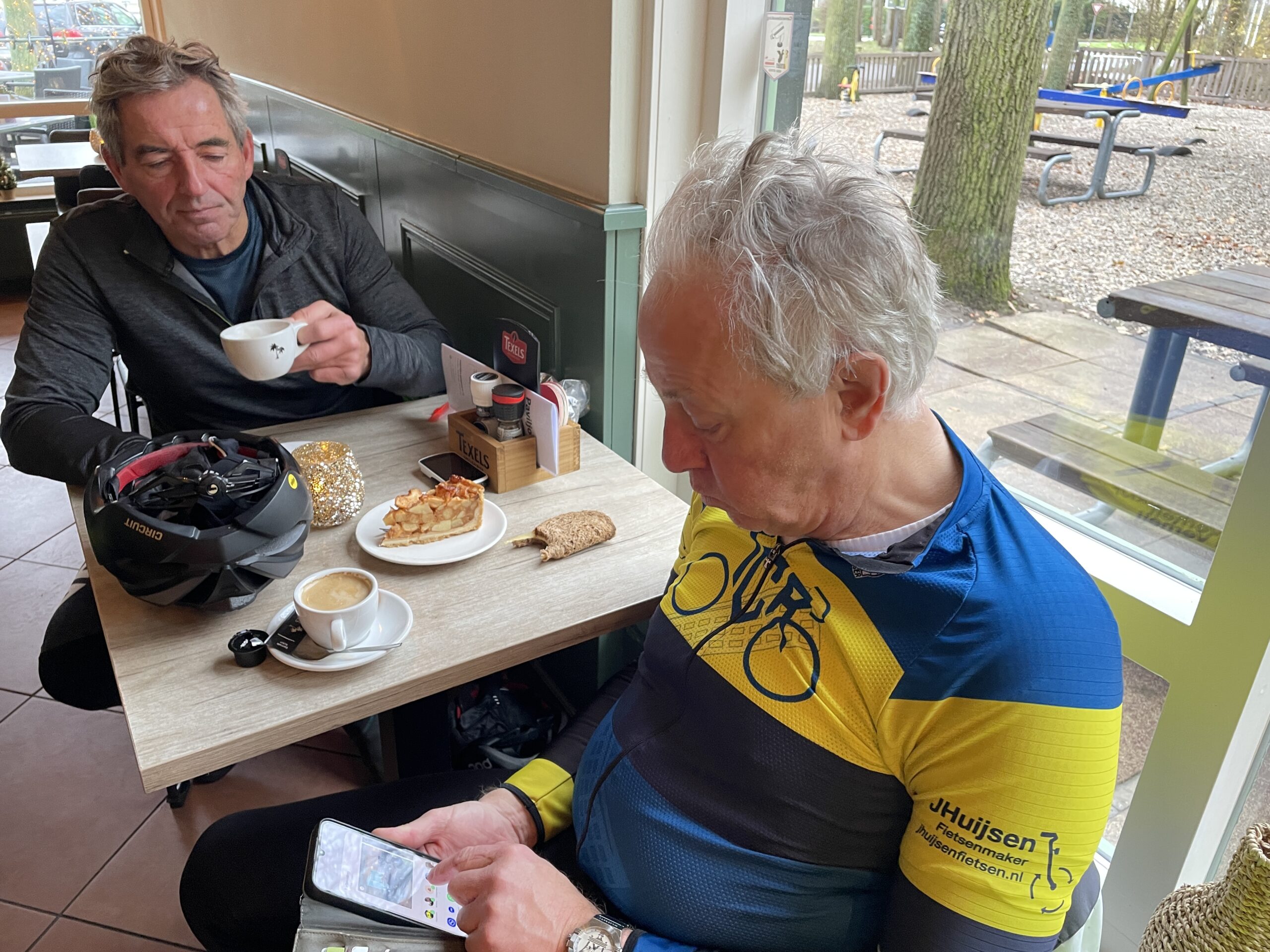Er zijn diverse voorstellen. De vraag aan Gerrit, die net binnenstapt: “Waar gaan we naartoe?” Het werd Wassenaar voor een bakkie bij de Klip, en jij mag gelijk op kop! Prima, het is voor mij een standaardroute via Delfgauw en door het Leidschendammerhout. Bij de Vogelplas Starrenvaart op verzoek een koekiestop. Ik doe het rustig aan en iedereen kan goed volgen. Dan volgt Voorschoten en het Valkenburgse Meer. Daar is nog steeds een wegafsluiting, maar dat is niet erg, want er is een andere weg en we komen even later weer op de route. Floris, die vroeg thuis wil zijn, haakt nu af en zoekt zijn eigen weg naar huis.