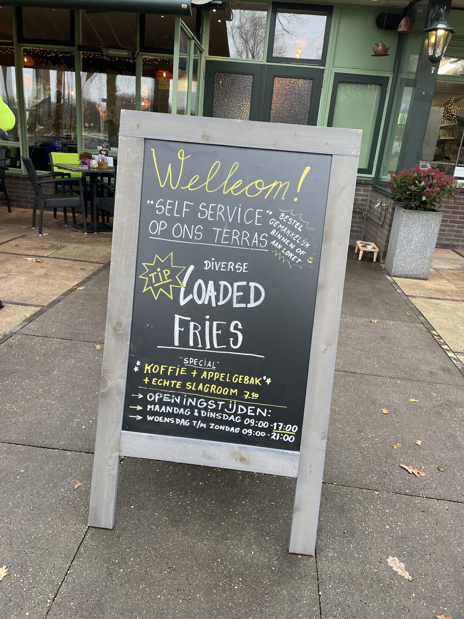 Wij rijden zigzaggend naar de Klip, die tegenwoordig weer open is. Het is er heel gezellig en behaaglijk, met vriendelijk personeel en een lekker bakje koffie. Ik zie van alles voorbijgaan: broodjes bal, tosti’s en appelpunten.