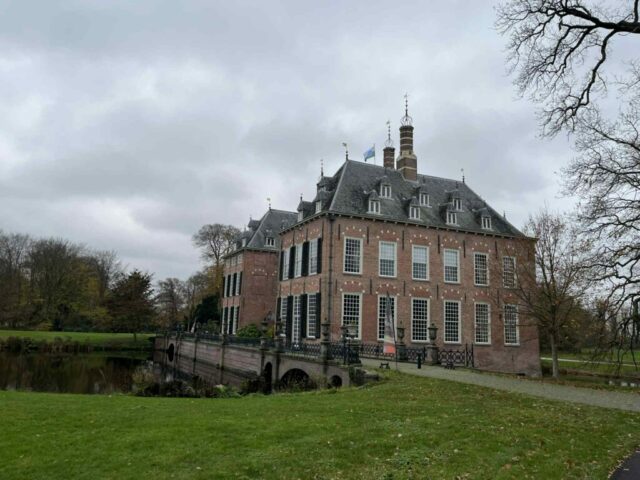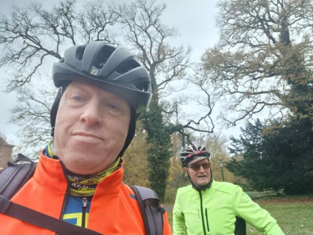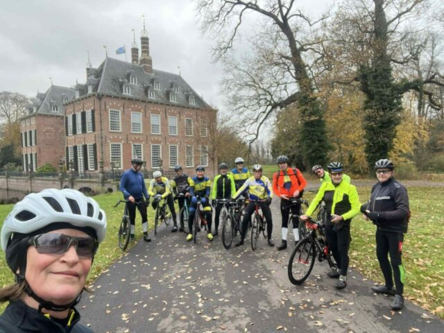 Wim wijst naar mij: “Jan, jij weet de weg.” En dus mag ik alweer op kop. Het tempo blijft rustig, want de noordoostenwind blaast stevig in het gezicht. Via De Zweth, Delfgauw en Nootdorp slingeren we richting het Leidschendammerhout. We rijden om de Vogelplas Starrevaart heen en nemen na het bekende tunneltje dit keer de afslag naar het kasteel. Een korte stop voor een fotomomentje — Johanna legt het natuurlijk weer vast.