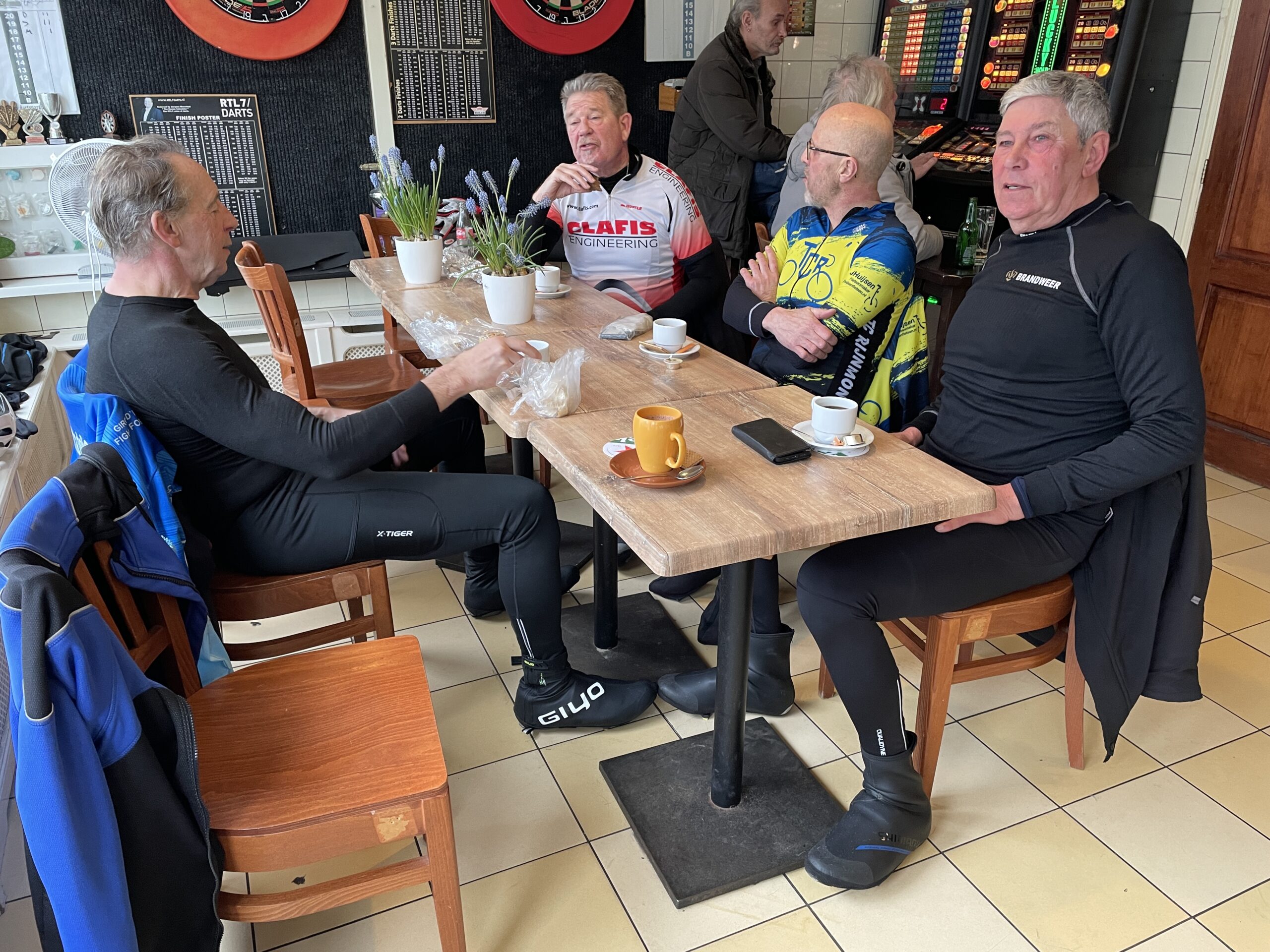 Dan de duinen in, met Gerrit op kop. We vormen een mooie waaier, de kop wordt regelmatig gewisseld, en zo staan we al snel bij “Loesje” voor de koffie- en chocoladebreak. Gelukkig komt Ron ook weer binnenvallen. De gebruikelijke grappen en plagerijtjes vliegen over tafel — we zijn wel wat gewend — en er wordt flink gelachen.
