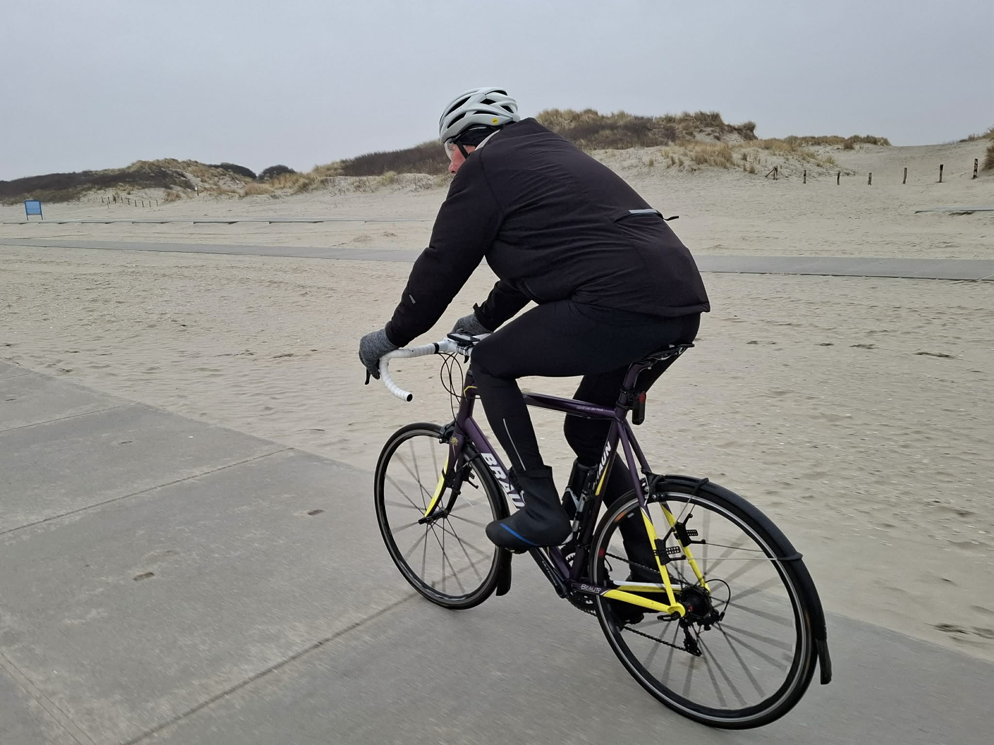 We rijden door naar het strand van Hoek van Holland. Volgens traditie gaan we meteen door, dit keer over de steltonplaten langs het strand. Alleen… waar is Ron? Waarschijnlijk over het fietspad gegaan.