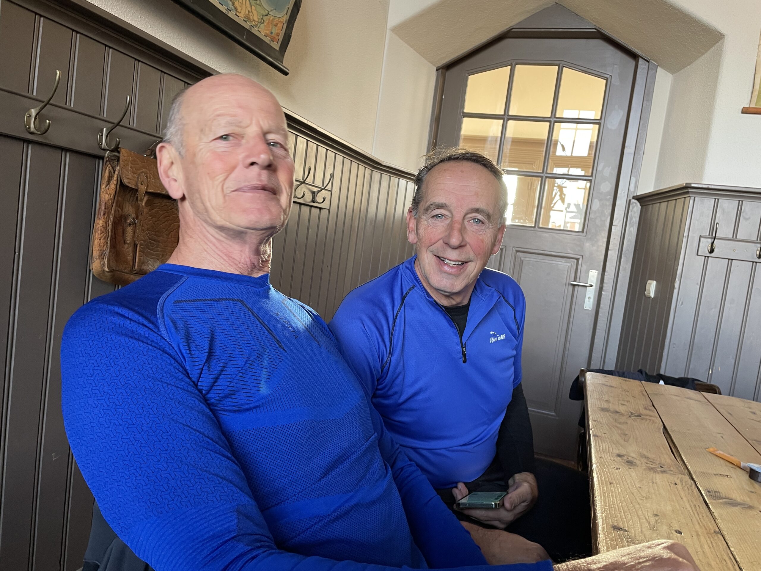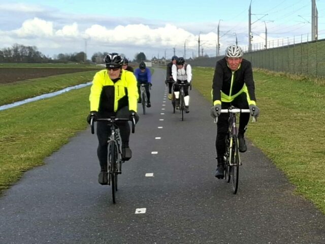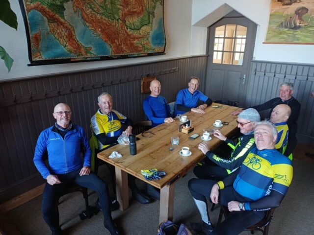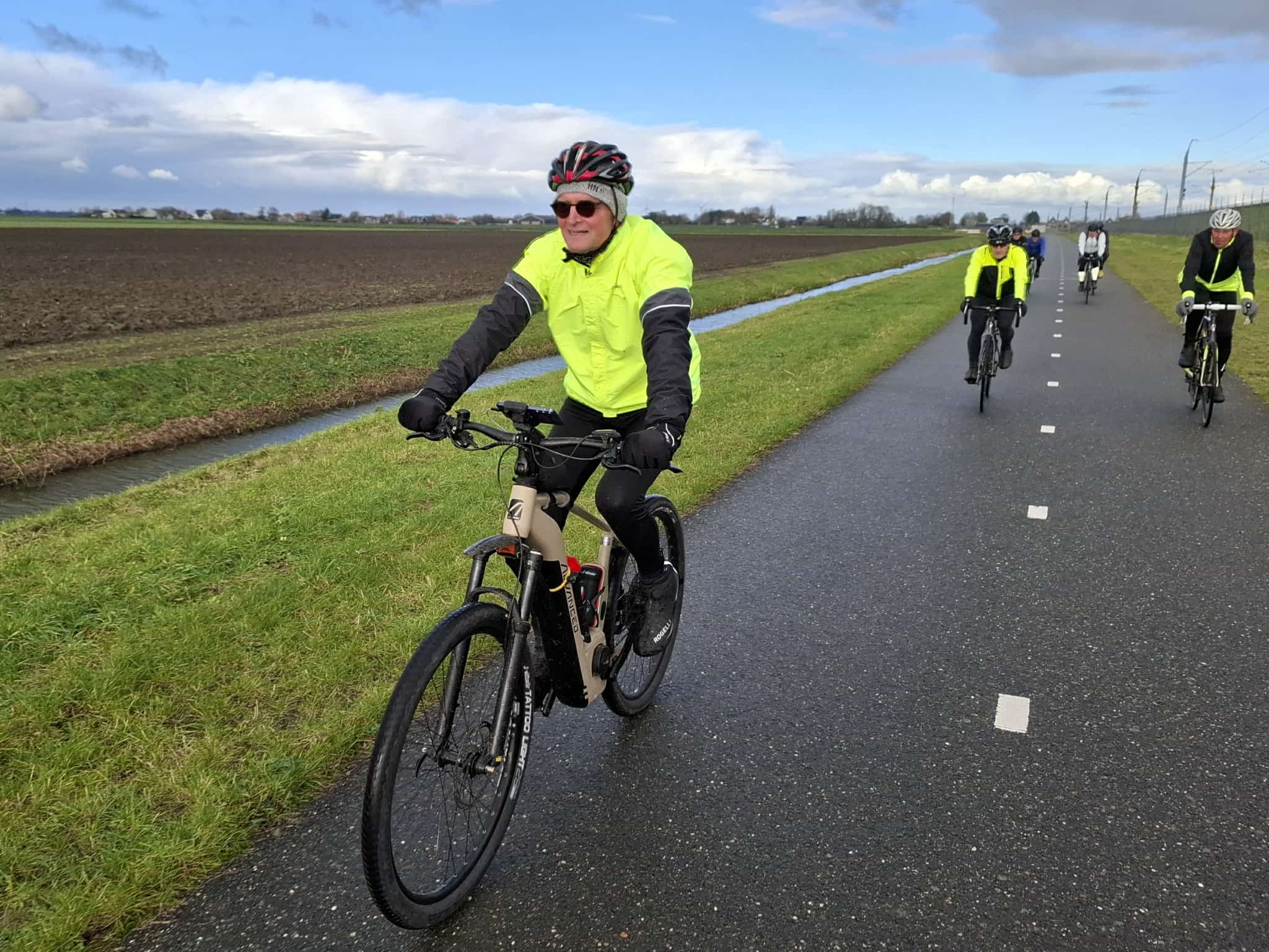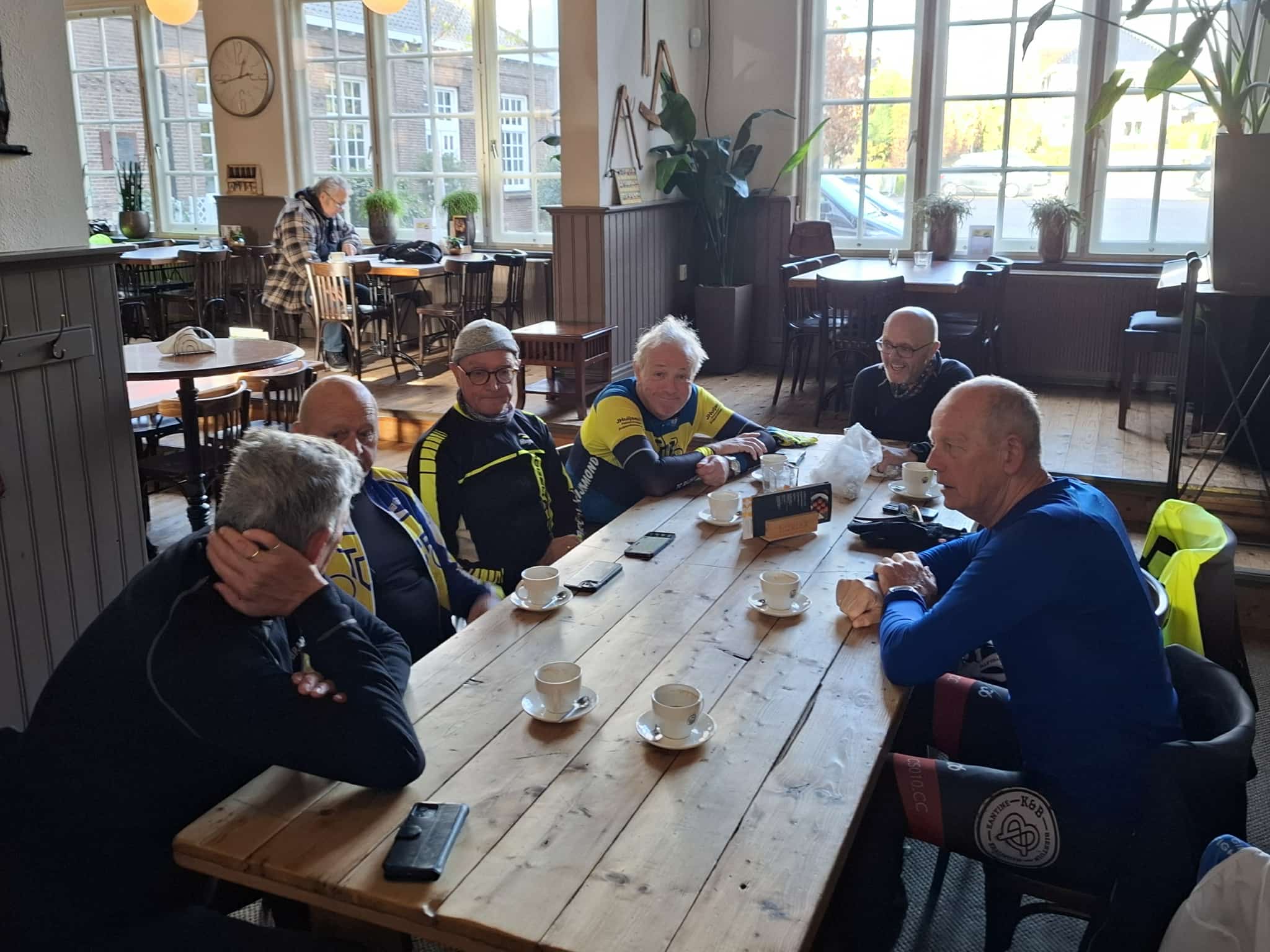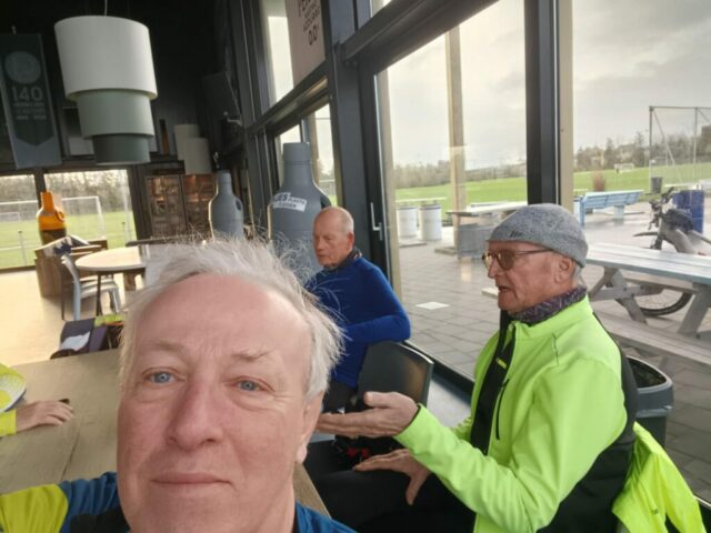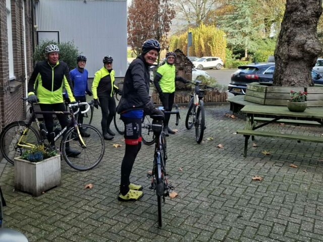 Op de Middelweg neem ik koppositie. In mijn ooghoek zie ik schaduwen dichterbij komen. Jawel: Gerrit schuift op, ik pak direct zijn wiel. Zoals verwacht volgt Leo, en Bert sluit aan. Even later zijn we weer compleet bij “De Juffrouw”. Binnen is het behaaglijk en gezellig. Onder het genot van koffie passeren elektrische fietsen en andere onderwerpen de revue.