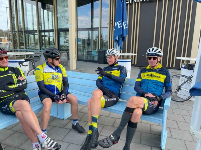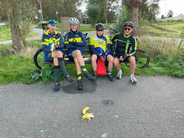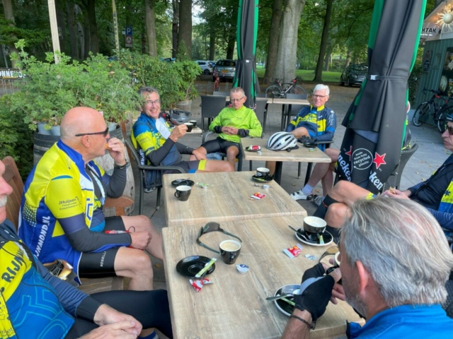 We trapten af via Windas, Delfgauw, Nootdorp en Leidschendammerhout. Bij de Vogelplas was het tijd voor onze traditionele koekiestop – altijd gezellig, en de koekjes smaken daar toch nét even beter. Daarna haakten Leo en BertS af, want die moesten vroeg thuis zijn. De rest ging door naar Voorschoten, met de bedoeling langs het Valkenburgse Meer te rijden, maar helaas, dat pad was nog steeds afgesloten. Dus rechtdoor, wat stadswerk, en uiteindelijk belandden we bij de “Zonnehof” voor een welverdiend bakje koffie. Het zonnetje deed zijn best en we plofte neer op het fijne terras, bediend door gezellige, vriendelijke dames. Na het aanhoren van grappen en sterke verhalen was het tijd om weer op pad te gaan. Mag ik weer op kop? Natuurlijk mag ik dat!