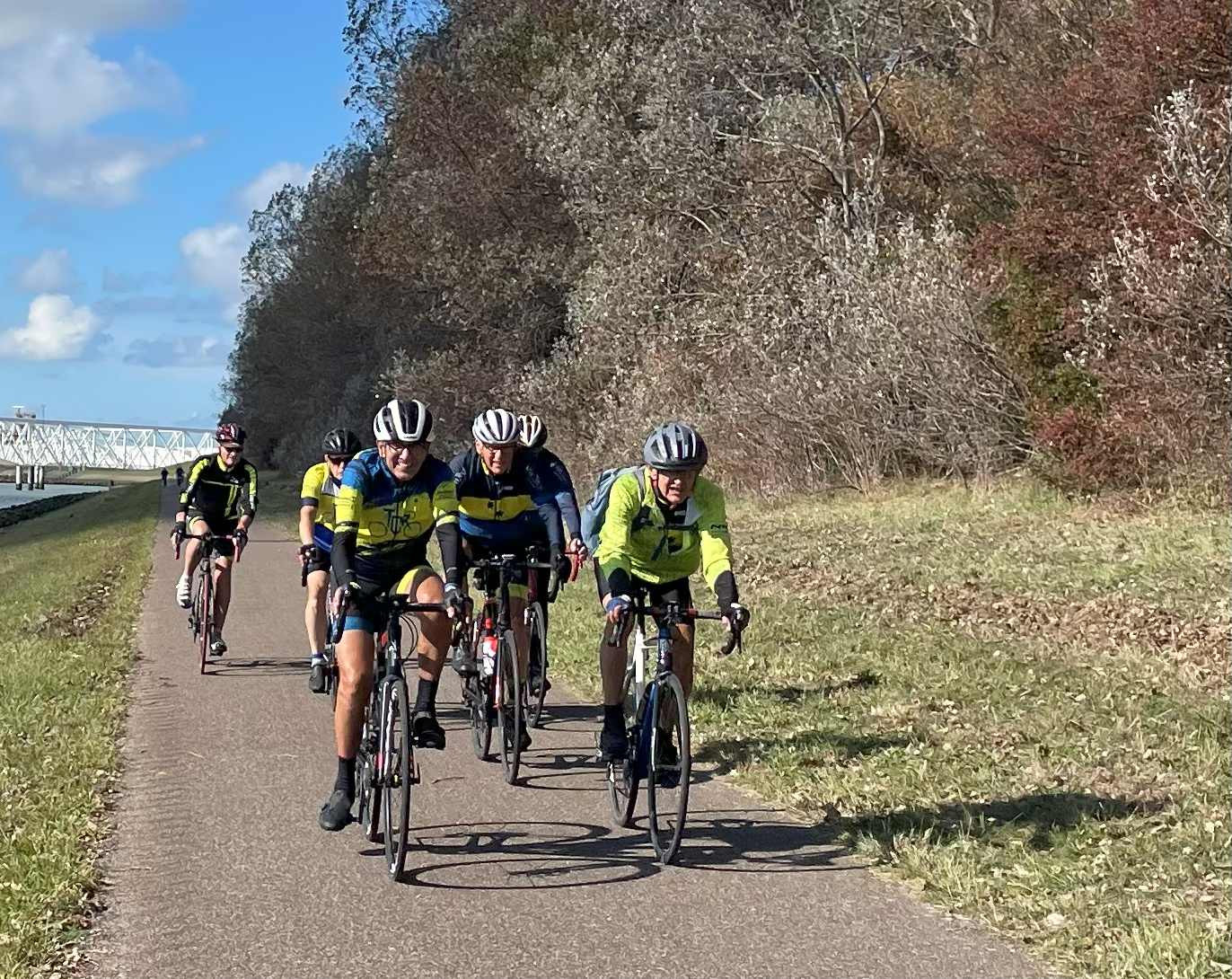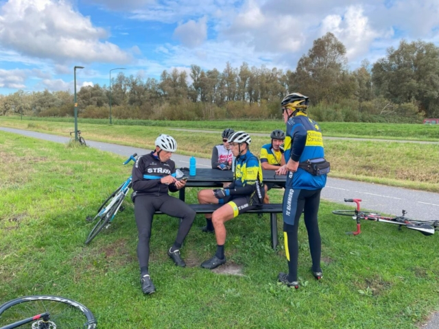 Het is alweer dinsdag, wat vliegt de tijd toch! Het weer was ons goed gezind: droge paden en een zacht briesje uit het noorden. Dus hup, op tijd naar de club. We waren met elf man sterk: BerdM, WimvP, FransvL, MarcelR, AlbertH, FritsvdW, OlafdH, BertS, en – verrassing! – LeoS sloot na de start ook nog aan. Ietsje te laat, maar ach, dat compenseren we met een vingerknip. En natuurlijk ging ondergetekende ook mee, want ja, wie anders?