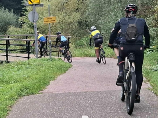 We wisten dat er een weg op breking zou zijn, maar kozen volgens afspraak voor de steltonplaten op het strand. Het zand lag er nog dik, dus rustig aan naar ons bankje voor de koekiebreak. Maar waar was Gerrit ineens gebleven? Langs de Waterweg nu met de sterk rijdende Albert op kop! Gelukkig kwam Gerrit later weer aansluiten, na wat klimwerk bij de Maaslandkering.