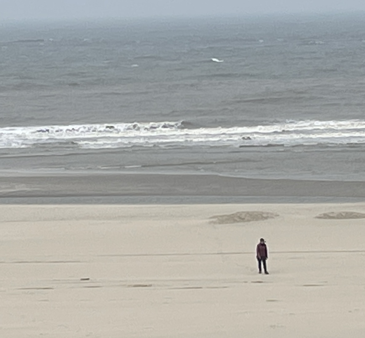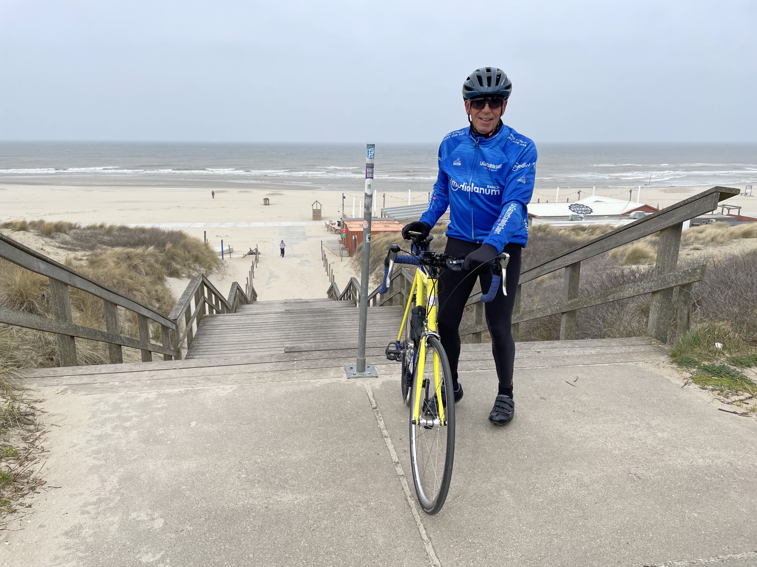 Aan de andere kant van de dijk wacht nóg een afsluiting. Dan maar via het Staelduinsebos, en even later duiken we de duinen in. Met volle bak wind in de rug vliegen we richting Kijkduin. Je hoeft amper te trappen — het voelt alsof je op een lopende band staat die nét iets te hard gaat. In no time staan we bij de zee, even kijken, even ademhalen, en dan door naar Loesje voor de koffiestop.