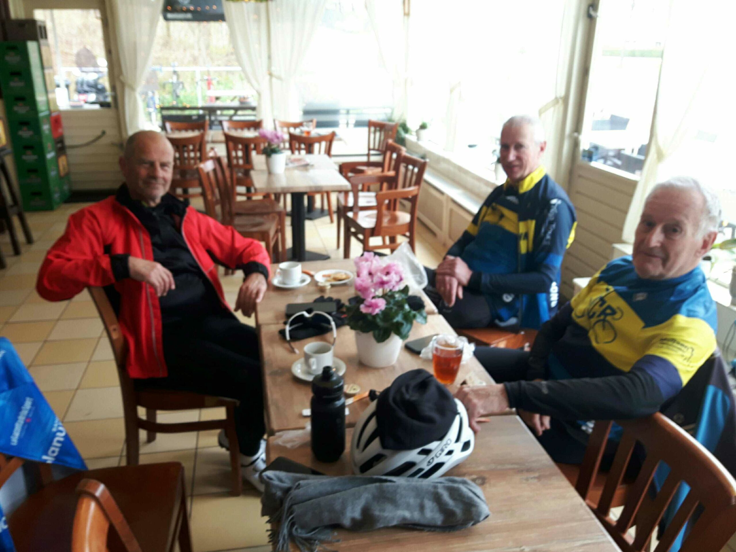 Daar zitten Rob en Sjaak al aan de koffie. Wij schuiven gezellig aan, zoals altijd een fijne sfeer en een prima bakkie (of thee). Daarna kiezen we voor de korte terugweg: via Ockenburg en Kwintsheul naar Schipluiden, door het Abtswoudse Bos, langs de Kandelaar en via het Beatrixpark weer richting huis. Vroeg thuis, makkelijk gefietst, en precies goed voor een dinsdag.